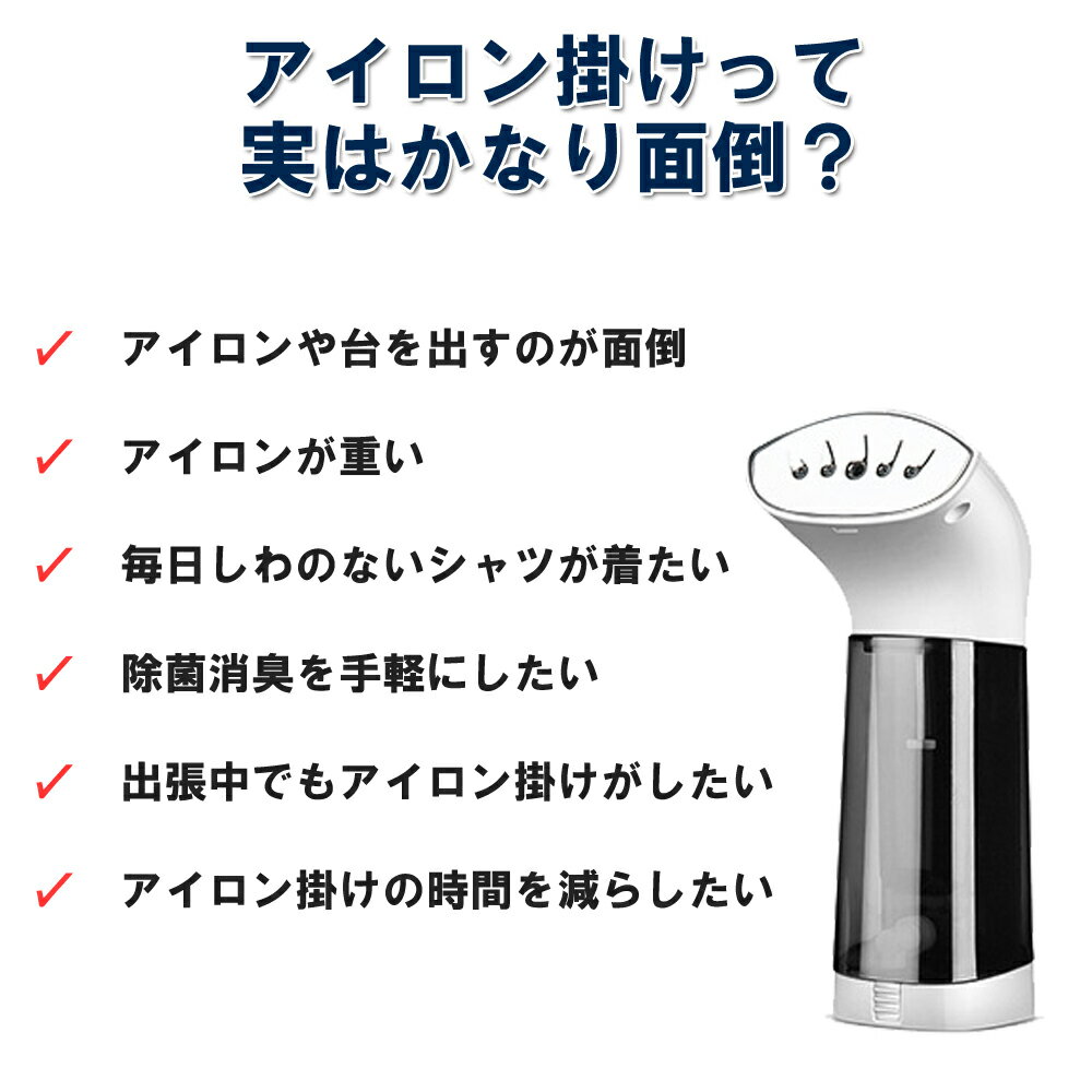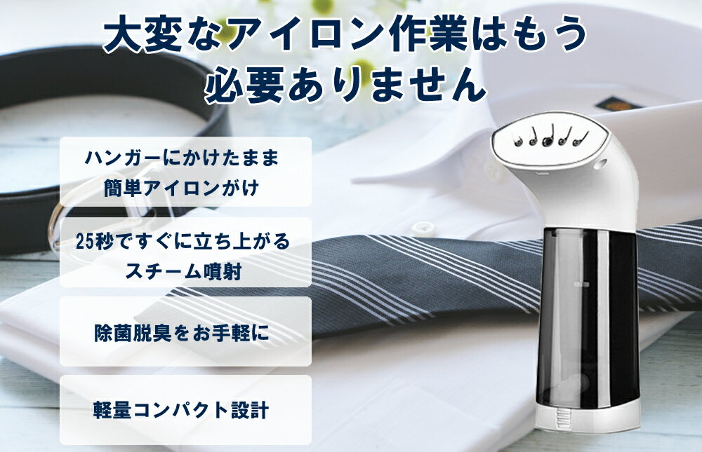 25秒で立ち上がり!ハンガーにかけたまま使えるスチームアイロン 商品名:ハンディースチームアイロン サイズ:約20×9×10cm コード長:164cm 本体重量:約500g(カップ、コード部分を除く) セット内容:本体×1(コード付き) 取扱説明書×1 アイロンミトン×1 コンパクトハンガー×1 定格電圧:100V 定格消費電力:800W 保証期間:メーカー保証 ご購入から1年間 立ち上がり25秒!使いたい時にすぐ使える衣類スチーマーが登場! 軽量なので腕も疲れにくく、ハンガーにかけたまま使用できるのでアイロン台を出し入れの面倒くささから解放されます。