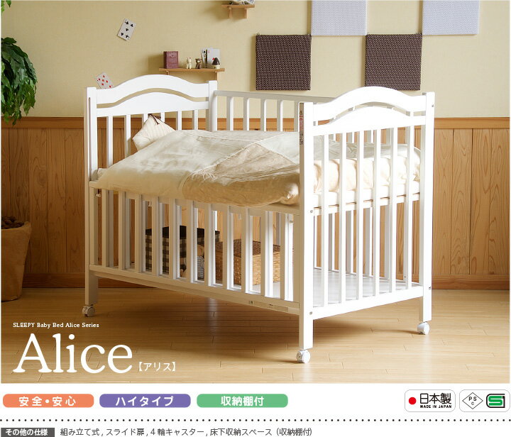 日本製ベビーベッド「NEW アリス WH(ホワイト)【B品】」 ハイタイプ 石崎家具